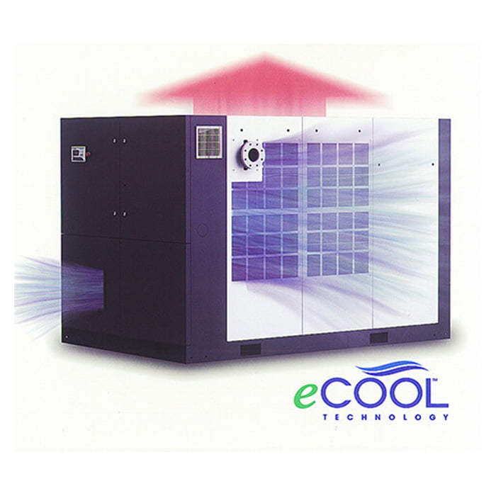 e-COOL™ 冷卻技術---離心風扇直接從機組外部吸入較冷空氣對冷卻器進行冷卻,並將熱空氣直接從頂部排出。冷卻器本身亦有極大的換熱面積,冷卻效果至佳。離心風機位於機體內部的一系列吸入孔,能同時將機組內部的熱空氣向頂部排出。這一獨特冷卻流場設計,使空壓機內部始終保持較低溫度,同時大大降低因風扇動作而產生的噪音。